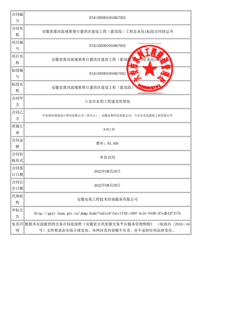 六安市水利局“安徽省淮河流域重要行蓄洪区建设工程(霍邱段)工程总承包1标段”合同公告