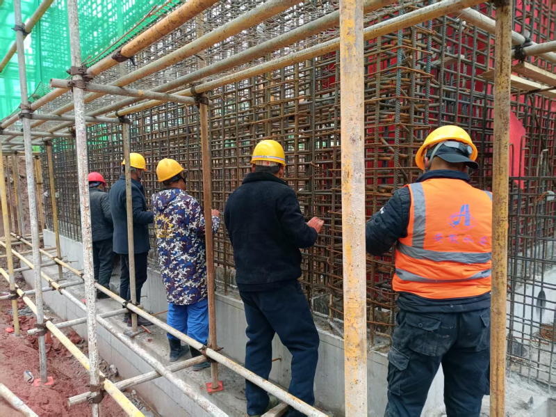 (裕安第二自来水厂续建工程,工人正在开展沉淀池钢筋绑扎