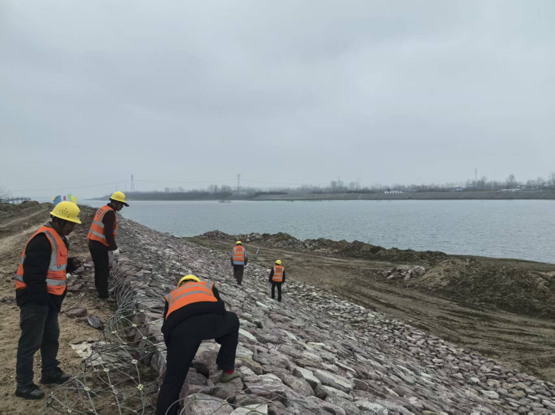 (淠河防洪治理工程狮子岗段,工人正在开展钢丝网兜碎石护坡)
