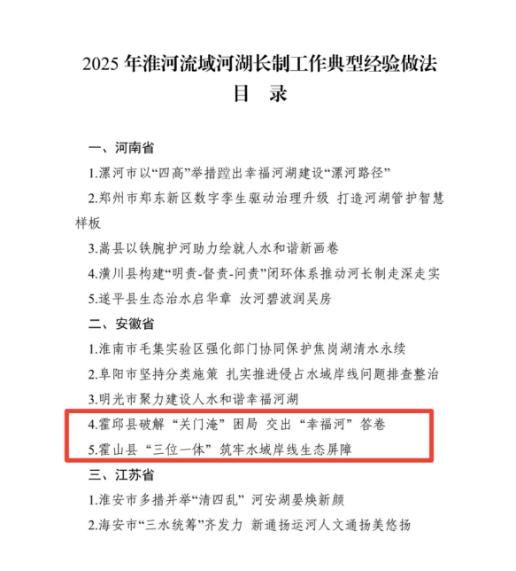霍邱县聚焦历史 “关门淹” 难题,以河湖长制为抓手,通过构建综合性防洪减灾体系、激活水资源效能、提升水环境质量等系统举措,精准破解水灾害困局,成功交出人水和谐的 “幸福河” 答卷。霍山县创新实践 “源头防控、数据赋能、专业管护” 三位一体治理模式,推动水域岸线精细化管控,筑牢生态屏障,切实守护绿水青山。