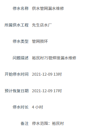 先生店水厂停水信息【2021-12-09 13时——2021-12-09 17时】